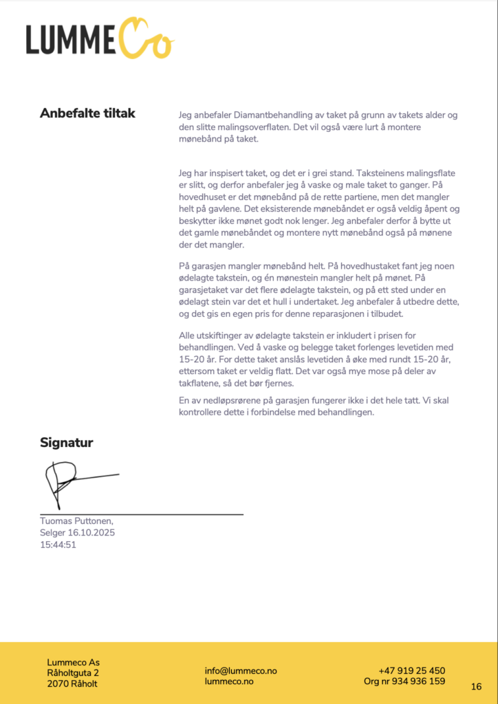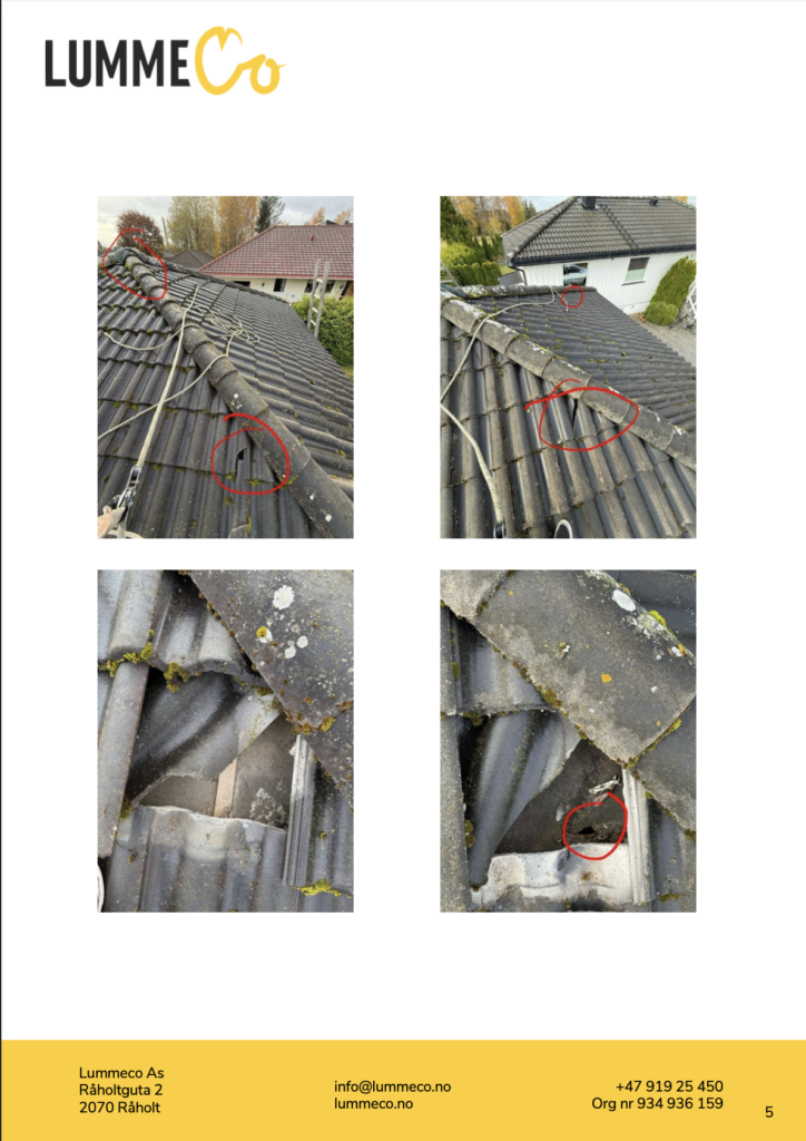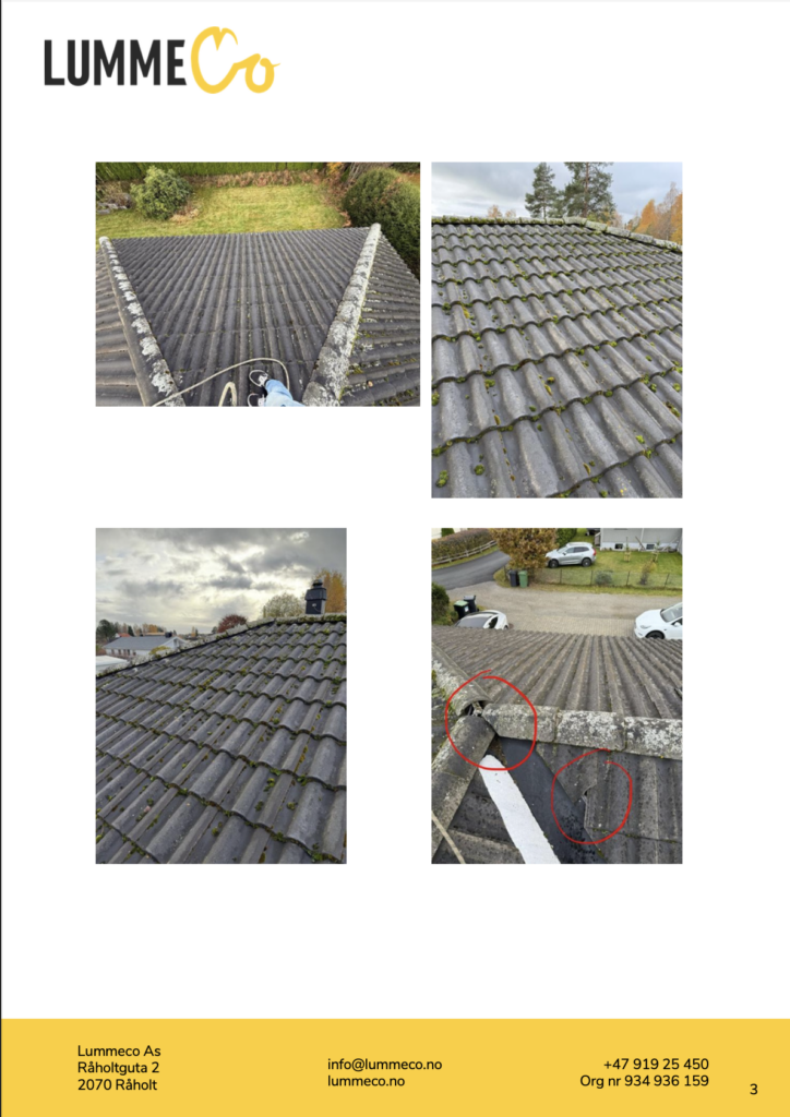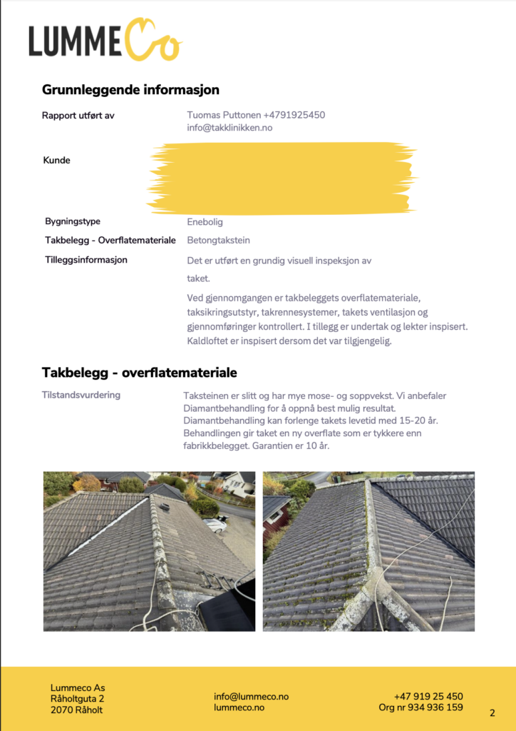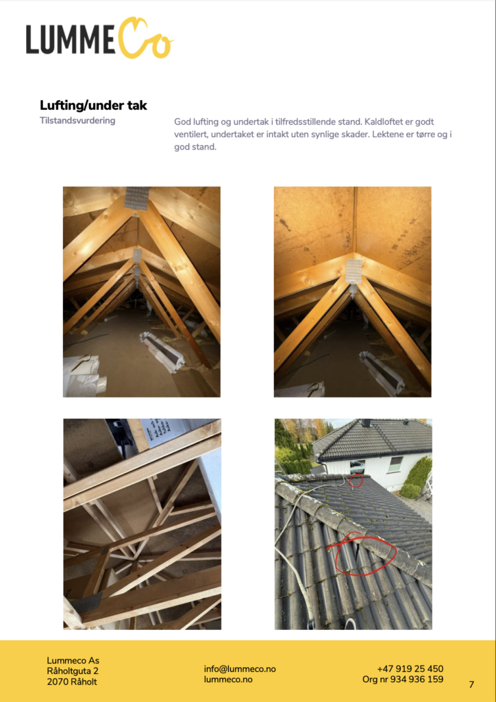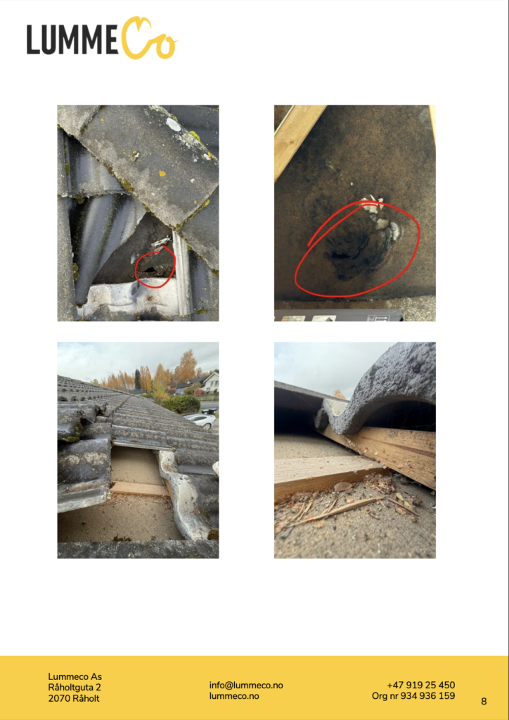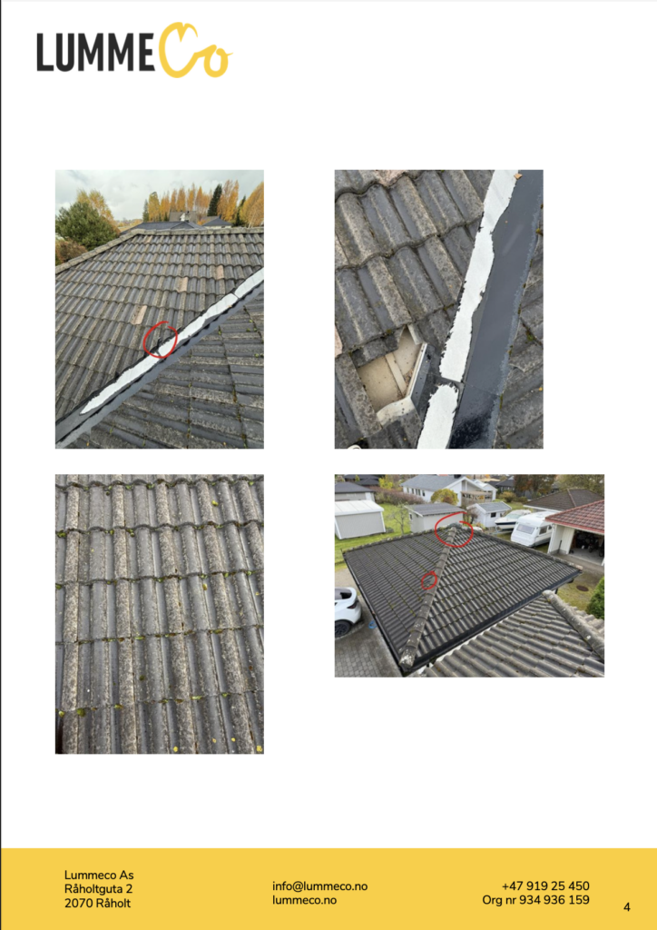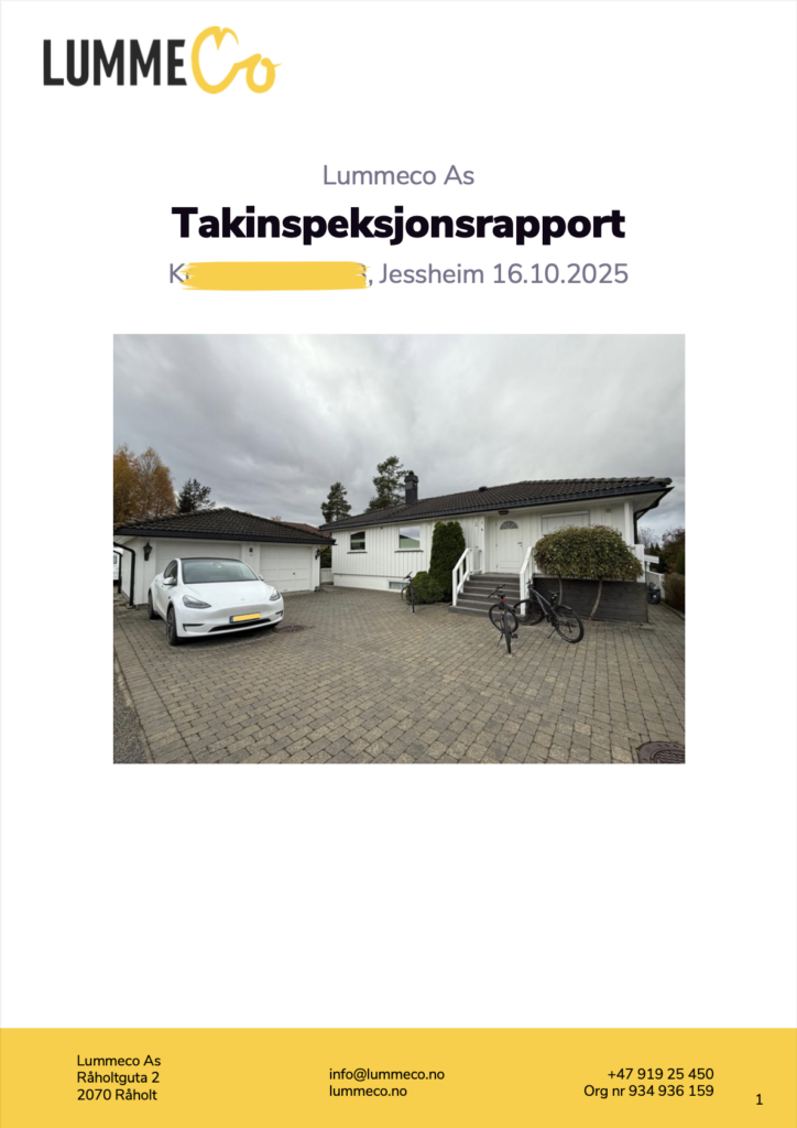 Hos LummeCo tilbyr vi en grundig og dokumentert taksjekk for deg som ønsker et tydelig og dokumentert beslutningsgrunnlag, basert på faktiske observasjoner – ikke antagelser.